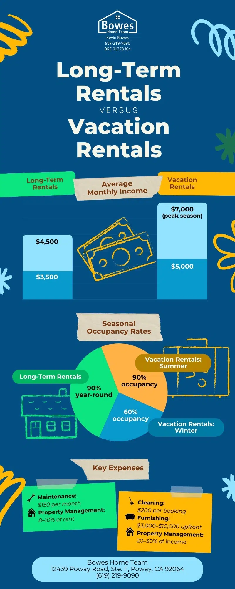 Ultimately, the decision between long-term and vacation rentals in San Diego comes down to your financial goals and the amount of time and effort you’re willing to invest. Vacation rentals offer higher income potential but come with increased operating costs and management responsibilities. On the other hand, long-term rentals provide more stable, predictable income with less frequent turnover but may not generate as much in rent. At Bowes Home Team, we specialize in helping property owners in San Diego make the most of their investments. Whether you’re considering a long-term rental or exploring the vacation rental market, our expert team can guide you through every step of the process. From property evaluation to management and marketing, we’re here to help you achieve your investment goals.